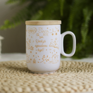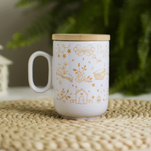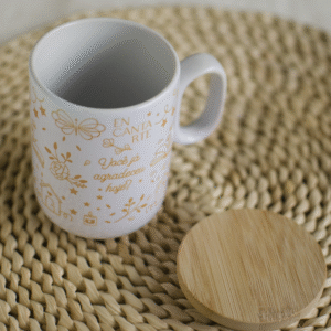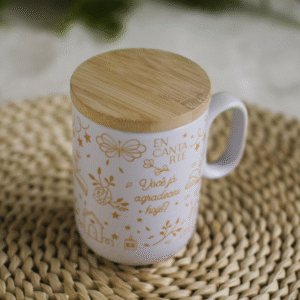 Caneca de cerâmica com tampa de bambu, perfeita para manter seu café ou chá quentinho enquanto você tece com fé, amor e encanto. Ideal para acompanhar seus momentos de criação e trazer um toque encantador para o seu ateliê. 💗